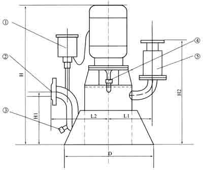 ①電動空氣控制閥 ②吸液口 ③加液口 ④出液口(帶逆止閥,本單位供) ⑤放空口