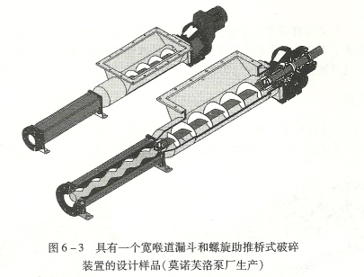 在輸送如此高黏度液體時的大挑戰(zhàn)是物體(看起來很難象流體)到達并進入泵吸人口的能力。在這種情況下,用特殊的螺旋推進器和寬喉道漏斗幫助流體進入到泵中,以預防斷流。圖6 -3舉例說明了這種設計。