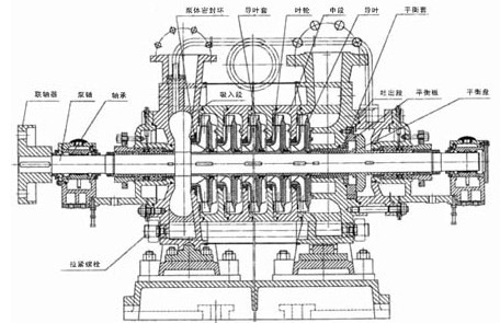 D、DG型泵進、出水口均為垂直向上,通過拉緊螺栓將泵的進水段、中段、出水段、軸承體等泵殼體部分聯結成一體。根據泵的揚程選擇泵的級數。該系列泵轉子部分主要由軸及安裝在軸上的葉輪、軸套、平衡盤等零件組成,其中葉輪的數量根據泵的級數而定。軸上零件用平鍵和軸螺母緊固使之與軸聯為一體。整個轉子由兩端滾動軸承或滑動軸承支承。軸承按型號不同而定,均不承受軸向力,其軸向力由平衡盤平衡。泵在運行中允許轉子在泵殼中軸向游動,不能采用向心球軸承。滾動軸承用油脂潤滑,滑動軸承用稀油潤滑,并用油環進行白潤滑,循環水冷卻。泵的進水段、中段、出水段之間的密封面均采用二硫化鉬潤滑脂密封,轉子部分與固定部分之間裝有密封環、導葉套等進行密封, 當密封環和導葉套的磨損程度已影響泵的工作性能時應予更換。的密封形式有機械密封和填料密封兩種。泵采用填料密封時,填料環的位置安放要正確,填料的松緊程度必須適當,以液體能一滴一滴滲出為宜。泵各種密封元件裝在密封箱內,箱內要通入一定壓力的水,起水封、水冷或水潤滑作用。在軸封處裝有可更換的軸套,保護泵軸。