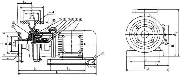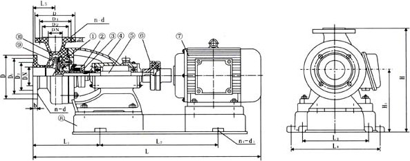6、如果更換滾珠軸承或泵軸時,必須拆下機架,松開前端軸承蓋4只螺釘。拆下泵軸后端螺母和聯軸器,將泵軸向前端方向打出即可,再后拆下后端軸封蓋。