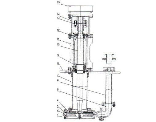 1、前蓋 2、泵體 3、葉輪 4、出水彎頭 5、排液管 7、聯接管 8、固定盤 9、軸承 10、軸 11、軸承體 12、軸承 13、聯軸器部件 14、電機架 15、電動機