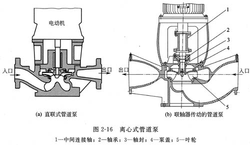 圖2-1 6(a)為直聯(lián)式管道泵。圖2—1 6(b)所示管道泵,以帶有中間連接軸的聯(lián)軸器傳動,在不必拆卸管線和拆除電動機的情況下,即可取出轉(zhuǎn)子組(包括葉輪、泵軸、軸承和軸封等)進行檢修,更適合化工生產(chǎn)特別是大型化工裝置應(yīng)用,加之管道泵占地面積小的優(yōu)點,如按離心式化工流程泵的標(biāo)準(zhǔn)和規(guī)范設(shè)計、制造和檢驗,可發(fā)展成管道式化工流程泵。