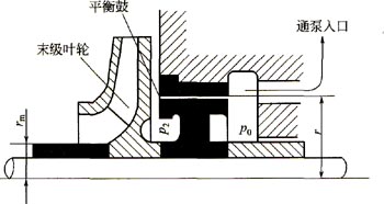 平衡盤左邊和末級葉輪出口相通,右邊則通過一接管和泵的吸入口相連。因此,平衡盤右邊的壓力接近于泵入口液體的壓力加,平衡盤左邊的壓力P’小于末級葉輪出口壓力P0。即高壓液體能通過平衡盤與平衡環之間的問隙%回流至泵的吸入口,在平衡盤兩側產生一個平衡力。