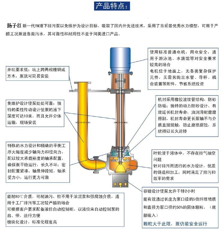 YW液下無堵塞排污泵產(chǎn)品特點: