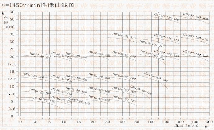 三、IHF氟塑料離心泵產(chǎn)品性能參數(shù): 型號 轉(zhuǎn)速(Rev)=2900r/min 介質(zhì)密度=1000kg/m3 轉(zhuǎn)速(Rev)=1450r/min 介質(zhì)密度=1000kg/m3 流量 揚程 電機功率kw 汽蝕余量m 效率 整機 流量 揚程 電機功率kw 汽蝕余量 效 率 整機 IHF40-25-125 4 21 1.5 2.0 40 90 2 5.5 0.55 2.0 34 80 6.3 20 3.2 5 10 18 4 3 IHF40-25-160 4 33 2.2 2.0 33 100 2 9 0.55 2.0 27 80 6.3 32 3.2 8 10 28 4 6 IHF40-25-200 4 51 4 2.0 26 140 2 13 0.75 2.0 20 80 6.3 50 3.2 12.5 10 47 4 10 IHF40-25-250 4 81 7.5 2.0 25 195 2 20.5 1.5 2.0 19 80 6.3 80 3.2 20 10 78 4 19.5 IHF50-32-125 7 22 2.2 3.0 51 105 4 5.5 0.55 3.0 45 80 12.5 20 6.3 5 15 16 8 3.5 IHF50-32-160 7 33 4 3.0 46 120 4 9 0.55 3.0 40 80 12.5 32 6.3 8 15 30 8 6 IHF50-32-200 7 51 7.5 3.0 39 170 4 13 1.1 3.0 33 92 12.5 50 6.3 12.5 15 47 8 10 IHF50-32-250 7 82 11 5.0 35 225 3.5 21 1.5 5.0 30 102 12.5 80 6.3 20 15 78 7 18 IHF65-50-125 15 22 3 3.5 62 110 8 5.5 0.55 3.5 55 80 25 20 12.5 5 35 18 15 3 IHF65-50-160 15 33 5.5 3.5 57 135 8 9 1.1 3.5 51 92 25 32 12.5 8 35 28 15 6 IHF65-40-200 15 51 11 3.5 52 210 8 13 1.5 3.5 46 110 25 50 12.5 12.5 35 45 15 10 IHF65-40-250 15 82 18.5 3.5 50 360 8 21 3 3.5 43 140 25 80 12.5 20 35 72 15 18 IHF80-65-125 35 22 5.5 4.0 69 155 16 5.5 1.1 4.0 64 110 50 20 25 5 60 18 35 3 IHF80-65-160 35 33 11 4.0 67 160 16 9 1.5 4.0 62 110 50 32 25 8 60 27 35 6 IHF80-50-200 35 52 15 4.0 63 240 16 13 2.2 4.0 57 120 50 50 25 12.5 60 45 35 10 IHF80-50-250 35 82 30 4.0 56 250 16 21 5.5 4.0 51 140 50 80 25 20 60 75 35 18 IHF100-80-125 65 22 11 4.5 77 230 35 5.5 1.5 4.5 74 130 100 20 50 5 120 18 60 3 IHF100-80-160 65 35 15 4.5 73 280 35 8.5 2.2 4.5 69 140 100 32 50 8 120 26 60 6 IHF100-65-200 65 51 30 4.5 73 420 35 13 5.5 4.5 68 320 100 50 50 12.5 120 43 60 10 IHF100-65-250 65 82 45 4.5 71 560 32.5 20.5 11 4.5 66 350 100 80 50 20 120 65 60 16.3 IHF125-100-160 100 38 30 5.0 70 440 50 10 5.5 5.0 74 300 160 32 80 8 180 26 90 6 IHF125-100-200 120 55 55 5.0 65 660 65 13 11 5.0 71 600 200 50 100 12.5 220 45 120 10 IHF125-100-250 65 21 15 5.0 72 620 100 20 120 18 IHF125-100-315 65 36 18.5 3.0 60 620 100 32 120 30 IHF150-125-250 130 22 22 7.0 67 700 200 20 240 18 IHF150-125-315 120 36 45 5.0 73 780 200 32 240 30 IHF150-125-400 120 55 75 7.0 75 920 200 50 400 46 IHF200-150-250 240 22 55 6.0 83 760 400 20 480 17 IHF200-150-315 240 36 75 7.5 75 840 400 32 480 29 IHF200-150-400 240 55 110 7.5 63 960 400 50 480 46 五、IHF氟塑料離心泵性能曲線 IHF氟塑料離心泵泵進口口徑<150mm: 1)關(guān)閉電源、進出口閥門,松開底腳螺栓;拆開防護罩將電機和泵頭聯(lián)軸器分開。 2)松開支架與泵體的連接螺栓、懸支架螺栓。可將葉輪、泵蓋、支架、軸承箱、機械密封從泵體上一并拆開。 3)松開泵軸端的緊固螺母,用銅棒敲擊螺母和拉緊螺栓,使葉輪的尾錐與泵軸上的錐套分開,葉輪、泵蓋、機械密封、支架、軸承箱各自分離。 4)松開機械密封動環(huán)的兩只緊固螺釘,可以從葉輪上退下機械密封動環(huán),在取下泵蓋,卸下泵蓋上的機械密壓蓋螺釘,可以從泵蓋上取下機械密封的靜環(huán)。 5)如需要更換泵體,則要拆下進出口管道的聯(lián)結(jié)螺栓和泵體的地腳螺栓 6)更換葉輪時,要卸下尾錐上的圓螺母。 IHF氟塑料離心泵進口口徑≥150mm: 1)關(guān)閉電源、進出口閥門,松開底腳螺栓;拆開防護罩將電機和泵頭聯(lián)軸器分開。 2)松開支架與泵體的連接螺栓、懸支架螺栓。可將葉輪、泵蓋、支架、軸承箱、機械密封從泵體上一并拆開。 3)直接取下裝有機械密封動環(huán)軸套,如有銹跡難卸,可利用軸上的反螺紋圓螺母旋下軸套。 4)松開機械密封壓蓋螺栓,可取下機械密封靜環(huán):松開機械密封動環(huán)的兩只緊固螺釘,可以從軸套上退下機械密封動環(huán)。 5)更換泵體,則要拆下進出口管道的聯(lián)結(jié)螺栓和泵體的地腳螺栓。