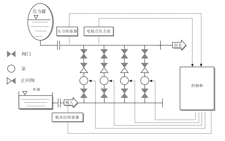 當(dāng)管網(wǎng)壓力大于啟動壓力設(shè)定值時由與出水管路連接的壓力罐供水,如果管網(wǎng)壓力等于啟動壓力設(shè)定值時啟動水泵,水泵運行中管網(wǎng)壓力達(dá)到停止壓力時停止水泵運行,水泵啟動后管網(wǎng)壓力超過啟動壓力,未達(dá)到停止壓力時水泵繼續(xù)運行;水泵全速運行后管網(wǎng)壓力未到達(dá)啟動壓力時水泵追加啟動。