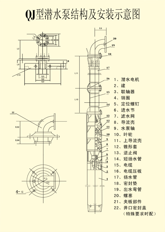 1、QJ型井用潛水泵機組由:水泵、潛水電機(包括電纜)、輸水管和控制開關四大部分組成。