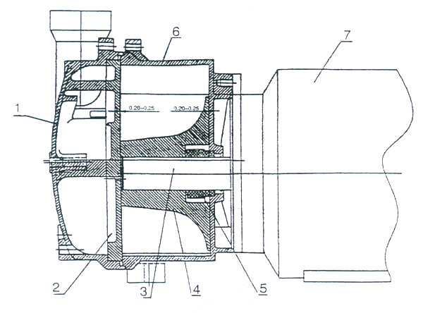 1.泵蓋 2.園盤(pán) 3.平鍵 4.葉輪 5.機(jī)械密封 6.泵體 7.電動(dòng)機(jī)