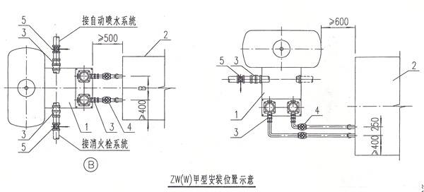 3.本設(shè)備供消防栓和自動(dòng)噴水兩套系統(tǒng)共用時(shí),在其出水管上設(shè)閥門(mén)分別與兩系統(tǒng)連接,見(jiàn)圖B所示