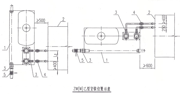 2.設(shè)在屋頂水箱間或底層水泵房的ZW(W)設(shè)備其安裝位置可參考本圖所示