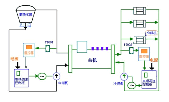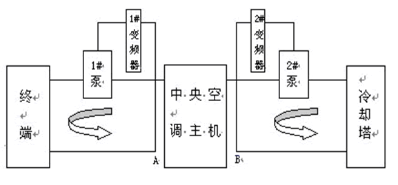 中央空調系統通常分為冷凍(媒)水和冷卻水兩個系統(如下圖,左半部分為冷凍(媒)水系統,右半部分為冷卻水系統)。根據國內外新資料介紹,并多處通過對在中央空調水泵系統進行閉環控制改造的成功范例進行考察,現在水泵系統節能改造的方案大都采用變頻器來實現。