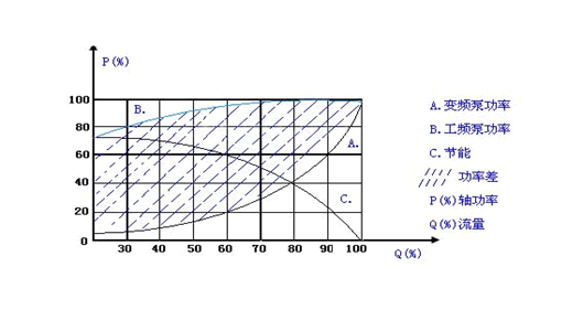 圖中陰影部分為同一臺水泵的工頻運行狀態與變頻運行狀態在隨著流量變化所耗功率差。