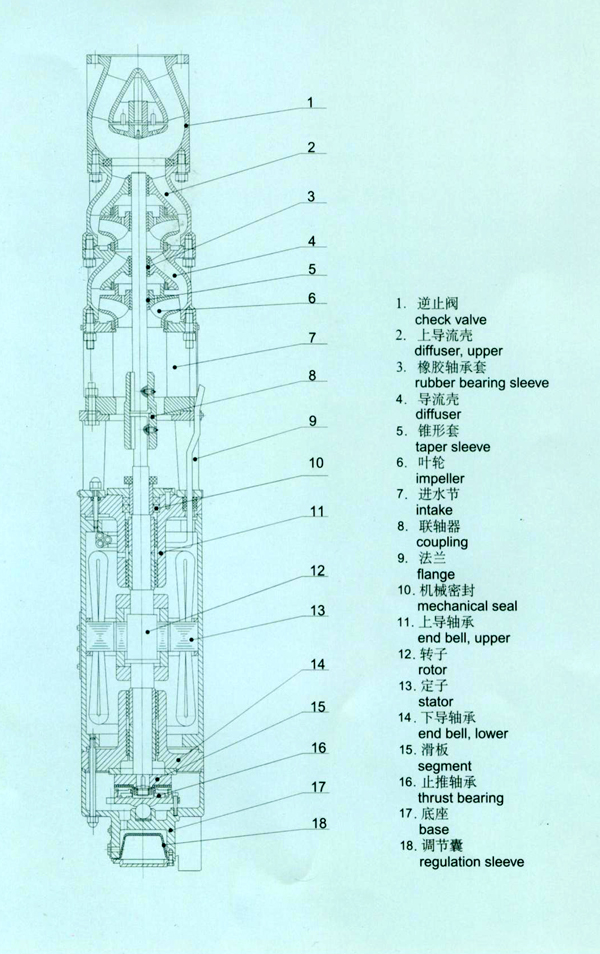 6.機組必須完全浸沒水中工作。立式使用,選擇型號時井陘與泵的型號要匹配,切忌大直徑的徑孔選用小直徑的泵,這樣不利于電機的散熱。