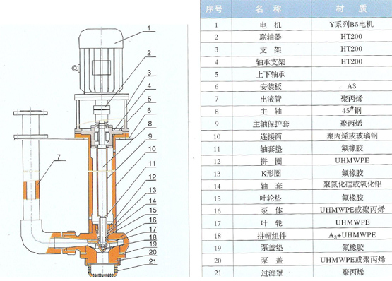 FYS耐腐耐磨液下泵為單級單吸立式泵。主要零部件有電機、電機支架、軸承架、底板、中間接管、泵軸、葉輪、泵體、出液管等。軸承為滾動軸承,采用油脂潤滑,用戶只要根據根據工藝選擇相應插入深度的泵,直接插入液體槽灌內,接上電源按照指定方向(切勿反轉)運轉即可。