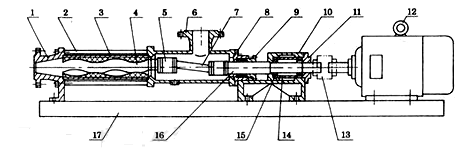 出料腔 2 拉桿 3 螺桿膠套 4 螺桿軸 5 萬向節(jié)總成 6 吸入口體